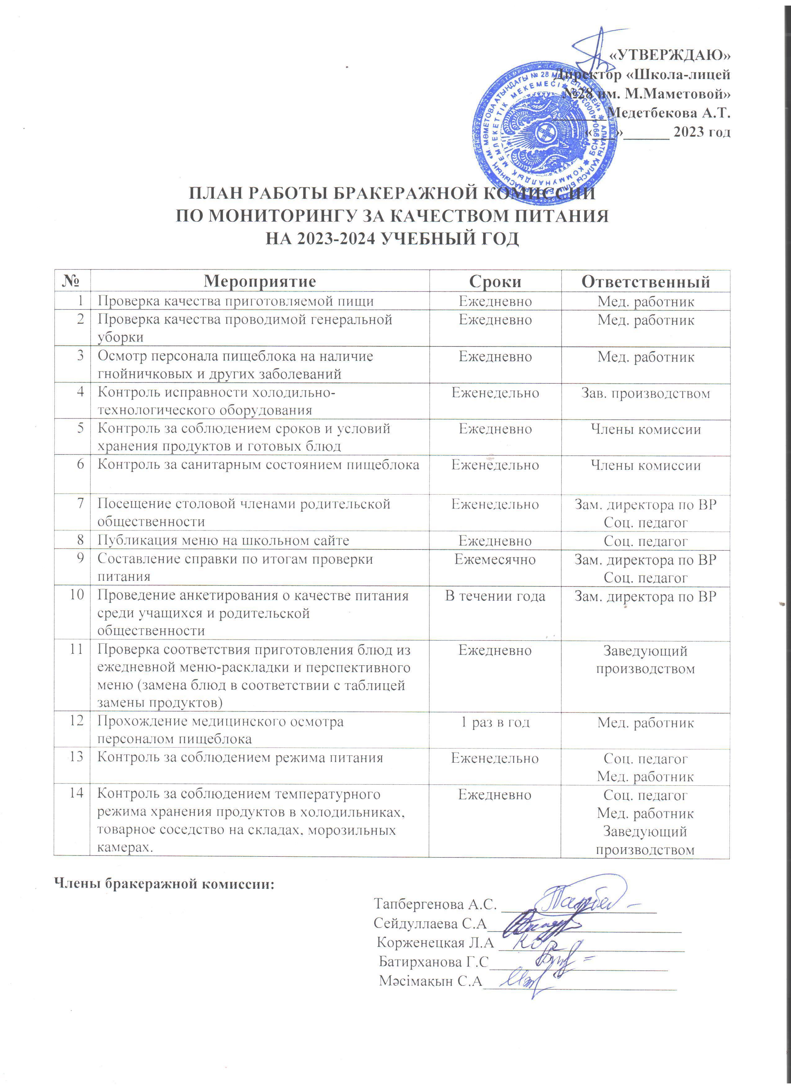 2023-2024 оқу жылына арналған ыстық тамақты бақылау-тексеру бойынша бракеражды комиссиясының жұмыс жоспары/План работы бракеражной комиссии по мониторингу за качеством питания на 2023-2024 учебный год