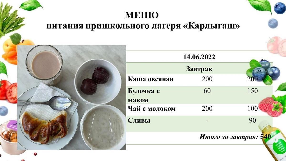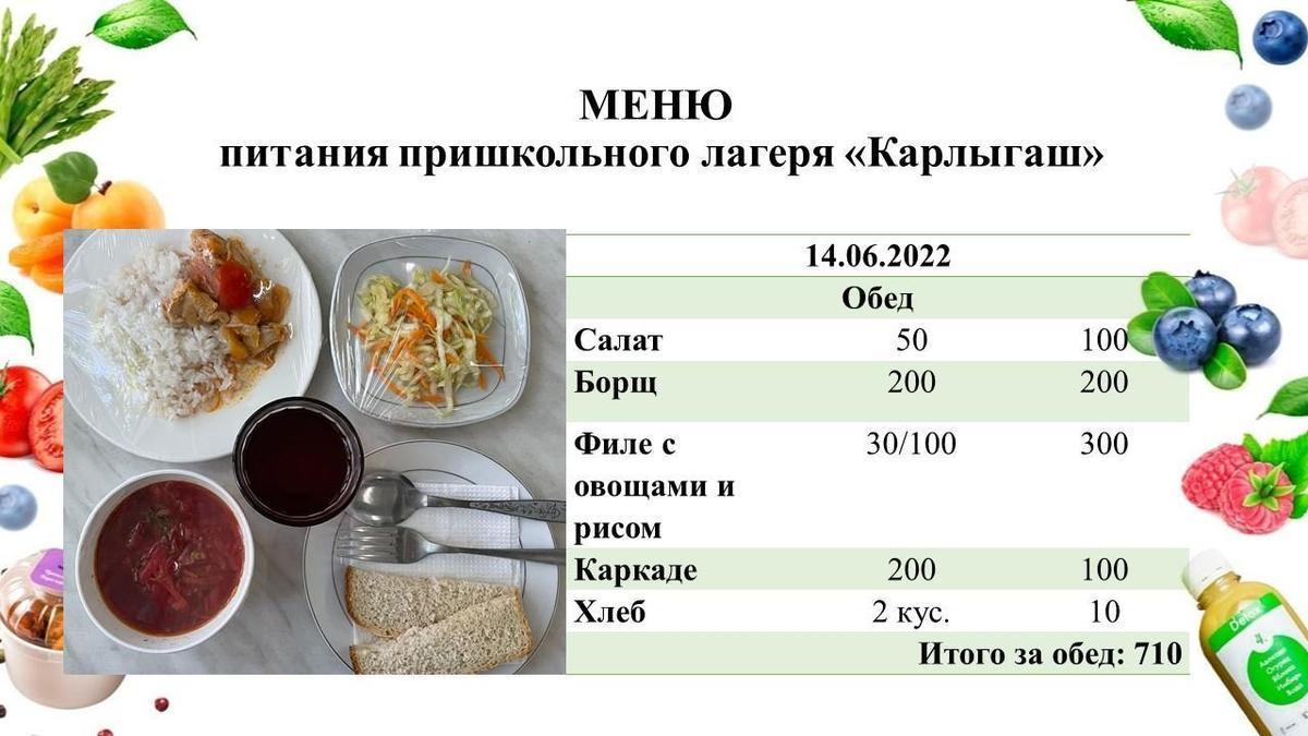 Меню пришкольного лагеря "Карлыгаш" 14.06.2022