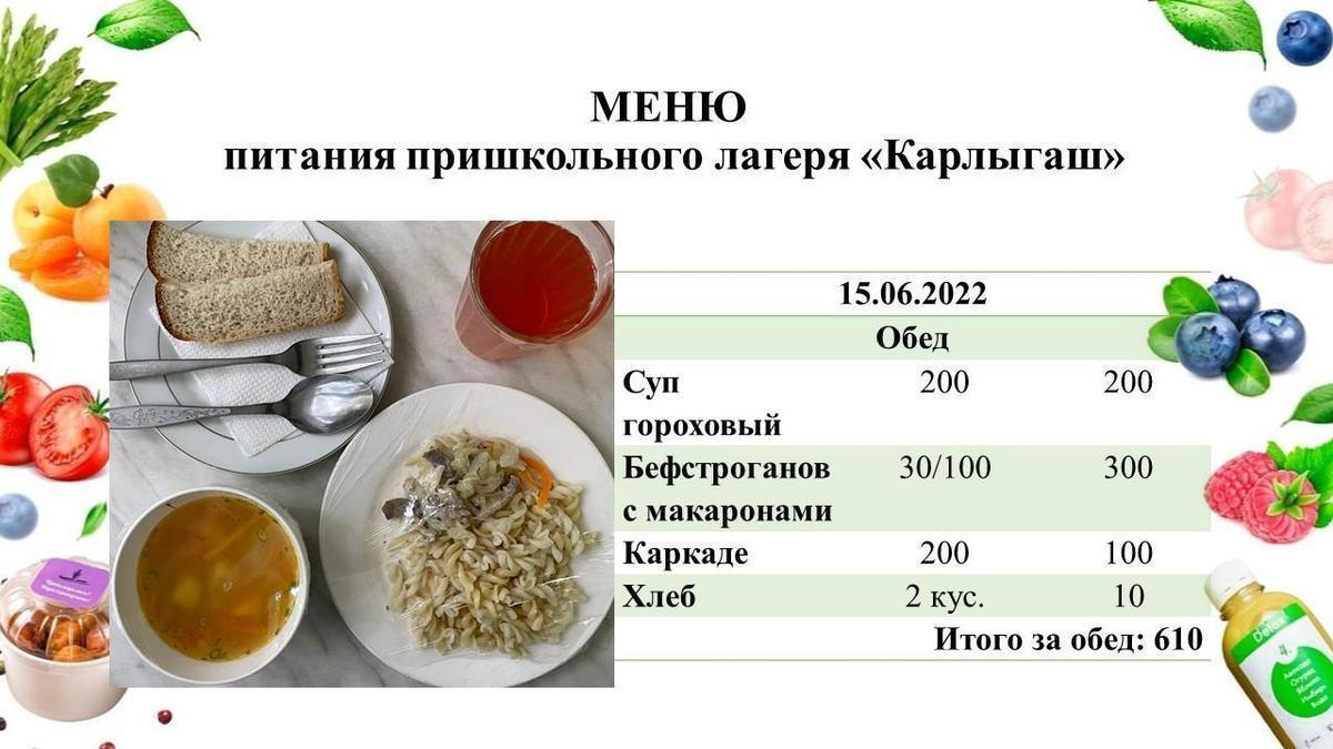 Меню пришкольного лагеря "Карлыгаш" 15.06.2022