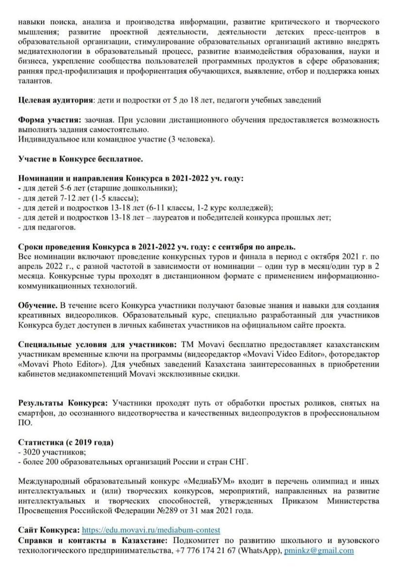 ООО «ТауКонсалт» (Новосибирск, ТМ Movavi) проводит Международный образовательный конкурс для тех, кто готов погрузиться в мир медиа-мейкерства и визуальных решений, освоить теорию и практику, пройти путь от новичка к осознанному видеотворчеству и креативному предпринимательству в сфере высоких технологий. КГУ «Школа-лицей № 28 им.М.Маметовой» является опорной площадкой конкурса. Цель Конкурса – развитие техно-предпринимательских навыков видеопроизводства у школьников и педагогов, которые включают в себя такие направления, как работа с текстом, фото и видеосъемка, сценарий, монтаж, публикация. 28 сентября, в 16:00 московского времени = 19.00 времени Алматы состоится установочный вебинар "«МедиаБУМ»: познакомимся поближе?", ссылка будет добавлена в объявление позднее на сайте конкурса https://edu.movavi.ru/mediabum-contesс. Конкурс будет проводиться в 2021-2022 уч. году: с сентября по апрель. ТМ Movavi бесплатно предоставляет казахстанским участникам временные ключи на программы (видеоредактор «Movavi Video Editor», фоторедактор «Movavi Photo Editor»). Для учебных заведений Казахстана заинтересованных в приобретении кабинетов медиакомпетенций Movavi эксклюзивные скидки.