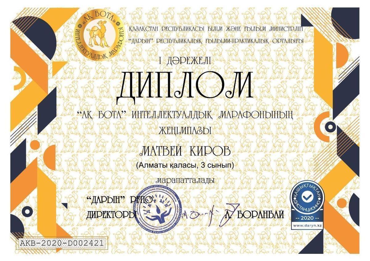 РЕСПУБЛИКАНСКИЙ НАУЧНО-ПРАКТИЧЕСКИЙ ЦЕНТР “ДАРЫН” 22-28 ноября 2020 года проводил в он-лайн режиме Республиканский Интеллектуальный марафон "Ақбота", ежегодно учащиеся КГУ «Школа-лицей №28 им.М.Маметовой» учувствуют в марафоне и показывают высокие результаты, этот год не стал исключением. Поздравляем победителей и призеров, желаем дальнейших побед, не теряйте тягу к знаниям, участвуйте в конкурсах, олимпиадах, показывайте свои знания, достигайте высоких результатов.