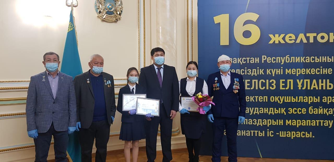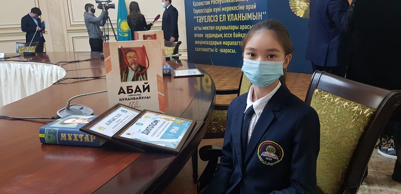 Тәуелсіздіктің қадір –қасиетін түсіну және өскелең ұрпақты патриотизмге тәрбиелеу мақсатында Медеу әкімшілігінің ұйымдастыруымен "Тәуелсіз ел ұланы" атты іс-шара ұйымдастырылып, байқауға Медеу ауданы бойынша 167 оқушы бақ сынасып, 10 оқушы жүлделі орындарға ие болды. Жеңімпаздардың қатарында мектеп-лицейіміздің 7 "Б" сынып оқушысы Қуандыкова Айару І-орын алып, Медеу әкімі Ә.Мусабаевтың қолынан мақтау қағазы және арнайы сыйлығымен марапатталды. Жетекшісі Епекова Лаура Даулетовнаға алғыс хат берілді. Медеу ауданының әкімі Масабаев Әсет Дүйсебекұлына және әкімшілік аппаратына алғысымызды айтамыз. Тәуелсіздік күнімен шын жүректен құттықтаймыз! Бейбіт аспанымызда қасиетті көк туымыз желбірей берсін! Тәуелсіздігіміз баянды болсын!